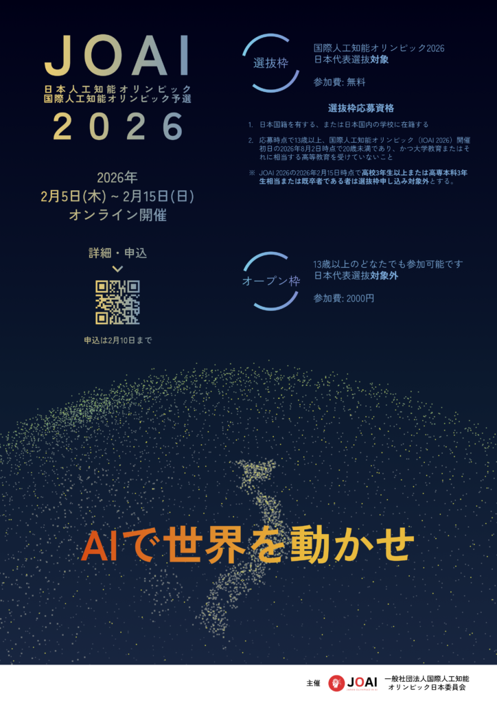 本大会は、国際人工知能オリンピック(IOAI)国際本部から正式に認証を受けた国内唯一の代表選抜大会です。 「選抜枠」の上位成績者から選出される日本代表(4名程度)は、2026年8月2日〜8日にアブダビで開催されるIOAI 2026へ派遣されます。 - Kaggleプラットフォームを用いた長期間の競技